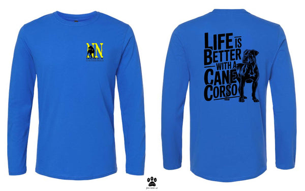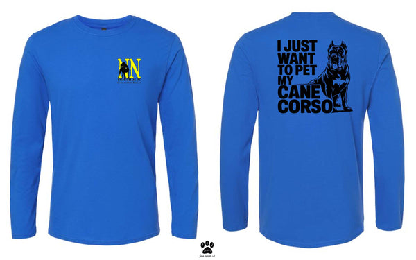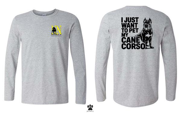 These are unisex cut, long sleeve t-shirts made by Gildan. They should fit true to size. All the shirts on this page have the Double N Cane Corso logo on the left breast and either the "I just want to pet my cane corso" or "Life is better with a cane corso" design on the back. Use the drop-down menus to create the shirt you want.